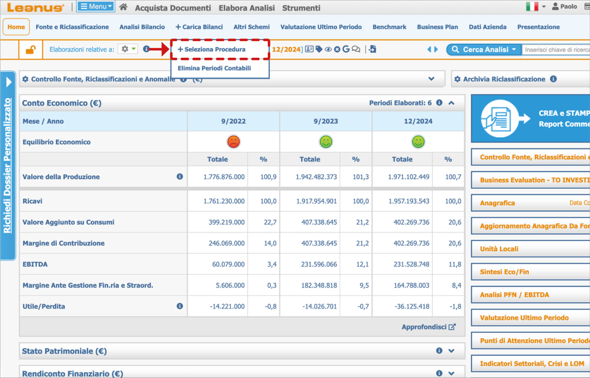 Creazione di una nuova analisi di bilancio tramite il sottomenu “+ Seleziona Procedura”