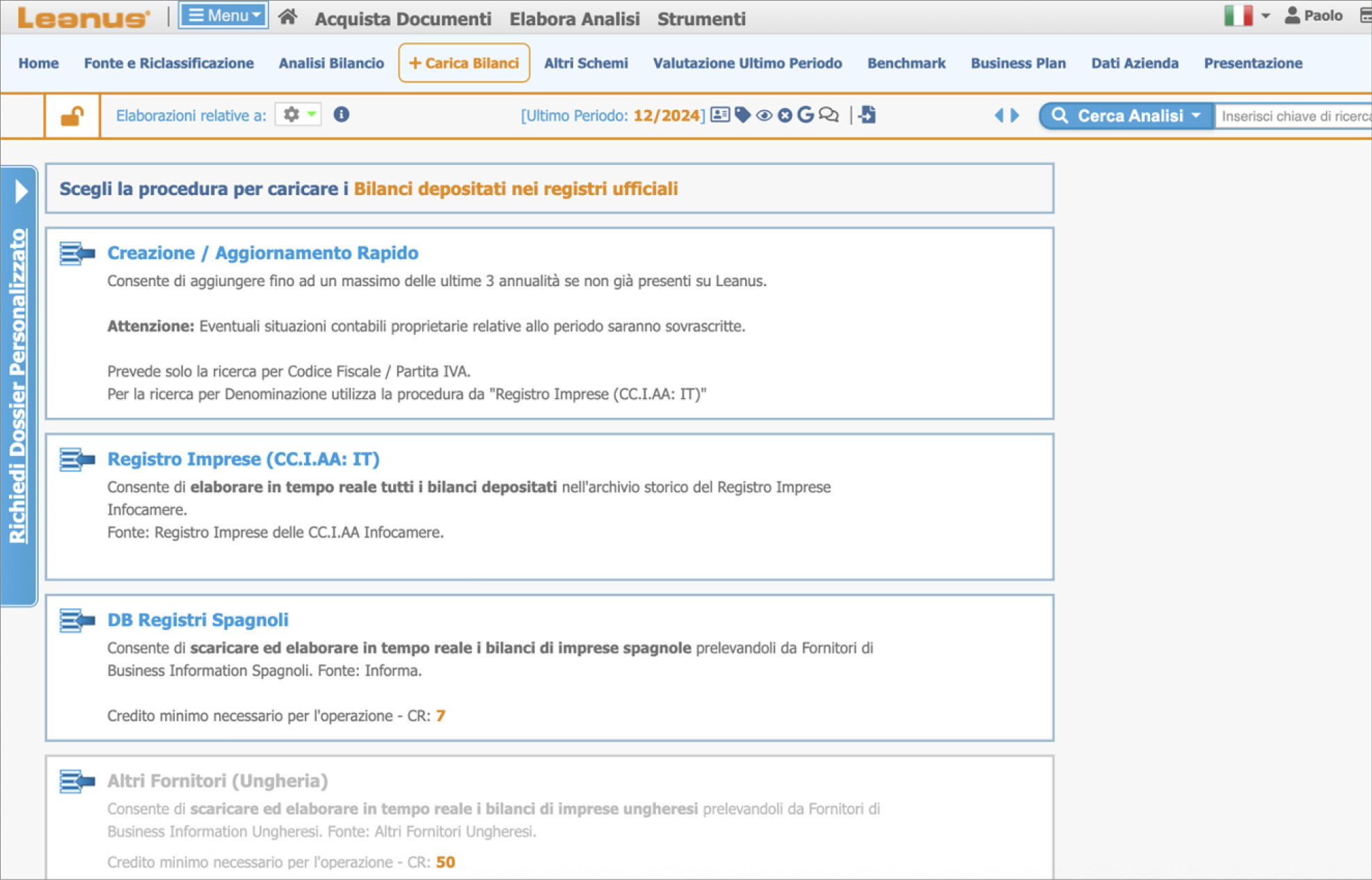 Il menu “+ Carica Bilanci” è il punto di accesso alle funzionalità che permettono di generare nuove analisi o aggiornare quelle esistenti, anche per aziende non presenti nell’archivio Leanus o nella propria Area Riservata.