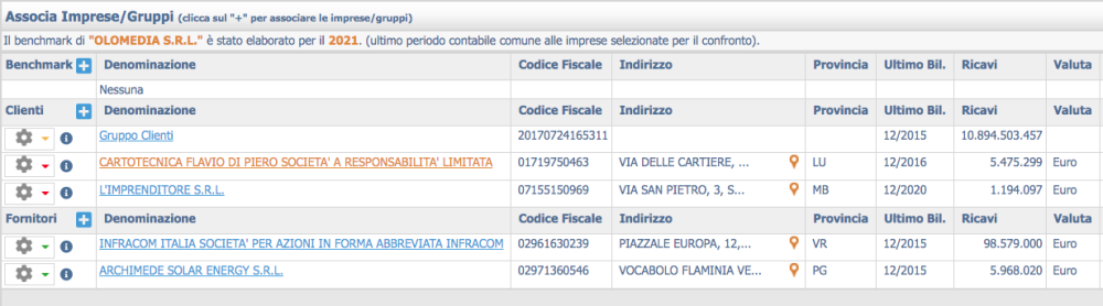 In the Benchmark /associate companies menu you can monitor the main customers and suppliers of the company in question. You can choose to associate: