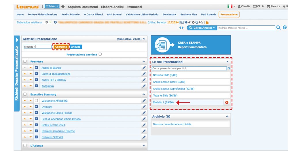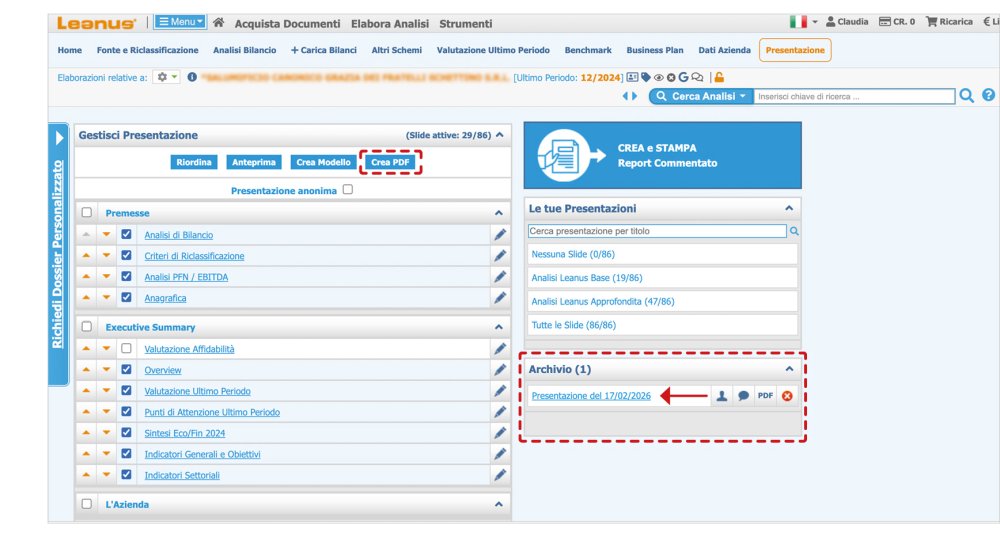 At the end of the procedure click on Create PDF, the presentation will be archived in the box Archive