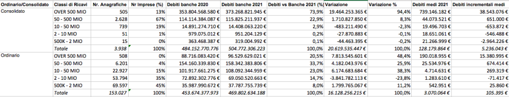 For Milano Finanza, Leanus analyzed the complete financial statements of 153.000 Italian companies divided by revenue category and those of 3.938 consolidated financial statements. In particular, in the period 2020-2021 Leanus found that the total amounts due to banks recorded in the balance sheet increased overall by around 16 billion euros, going from 453 to 469 billion. Although this is a net increase, it is interesting to note that companies between 500K and 2M€ were allocated slightly less than 2Bn against the 12 billion allocated to companies with revenues greater than 50 million Euros. The balance of the 2-10 million segment is even negative.