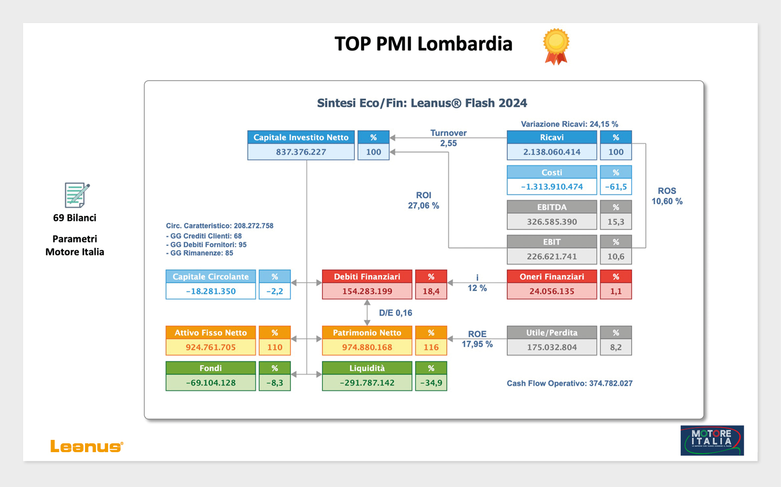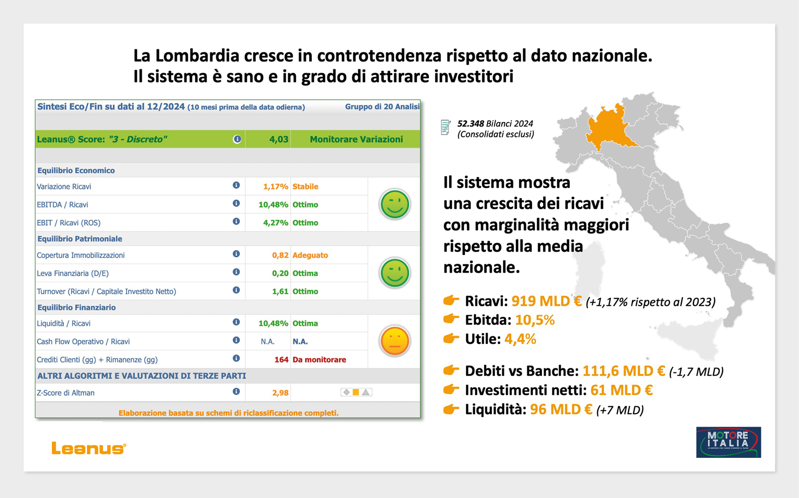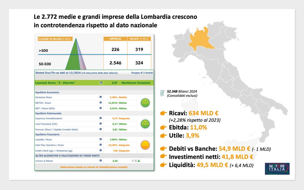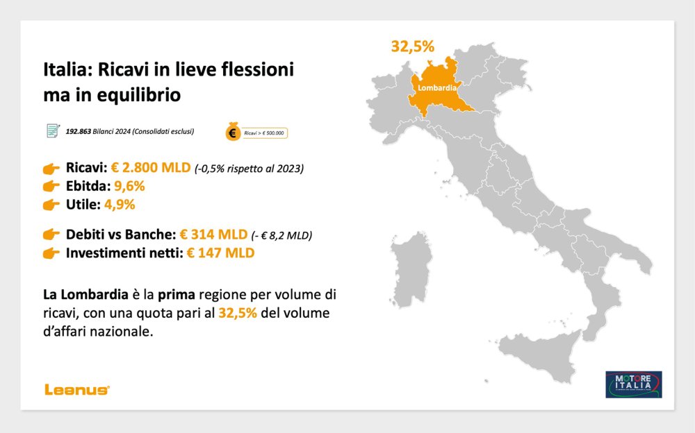 Italy shows a slight decline in revenues, but overall it maintains a structural balance. In this scenario, Lombardy confirms its leadership, generating 32,5% alone of national turnover. Financial indicators also remain solid, with declining bank debt and continued significant investments.