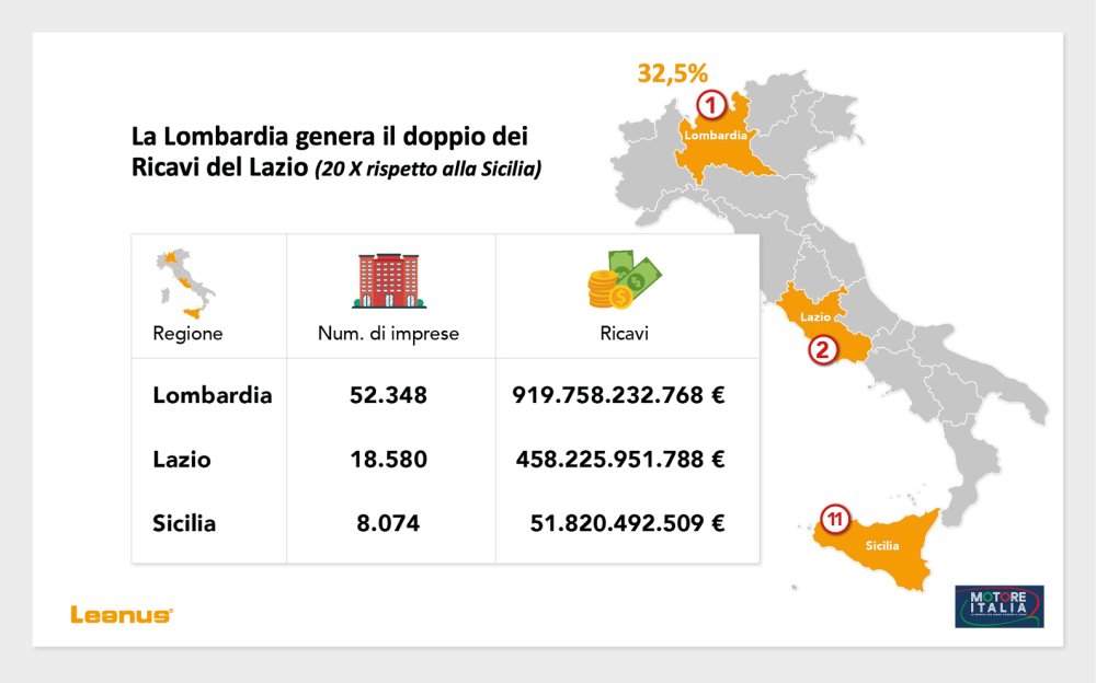 Lombardy's role becomes even more evident when compared with other regions: the revenue volume is almost double that of Lazio and twenty times higher than that of Sicily. This result is supported by a much higher number of active companies and an extremely dynamic production network.
