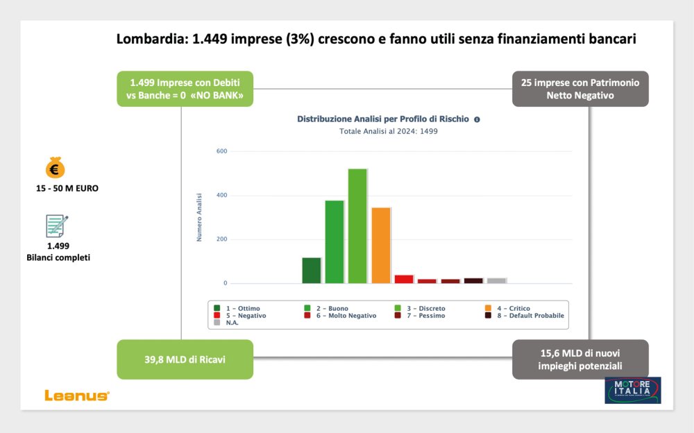 A very interesting fact concerns approximately 1.449 businesses are growing and generating profits without resorting to bank loans. This is the 3% of the Lombardy system and they represent extraordinary potential, with over €15 billion in new loans available. Only a small portion are experiencing financial difficulties.