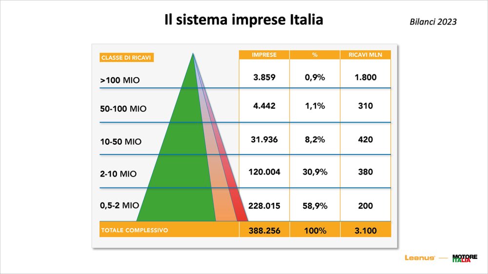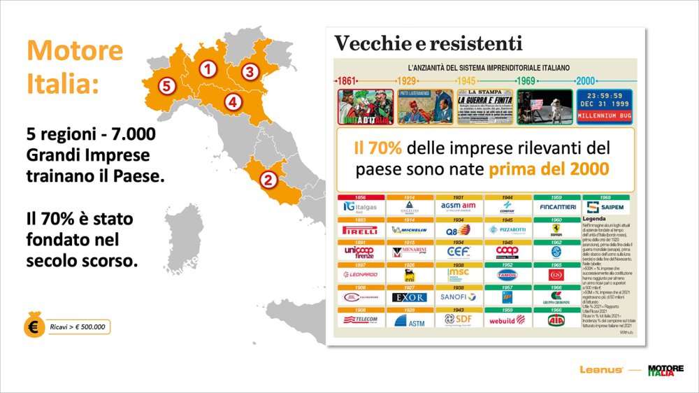 «70% of Italian GDP is driven by 2% of businesses. "Businesses with revenues above 500 thousand euros are just under 400 thousand" highlighted the administrator of Leanus. "7 thousand large companies drive the country, they reside in 5 regions. 70% of the relevant companies in the country were born before 2000".