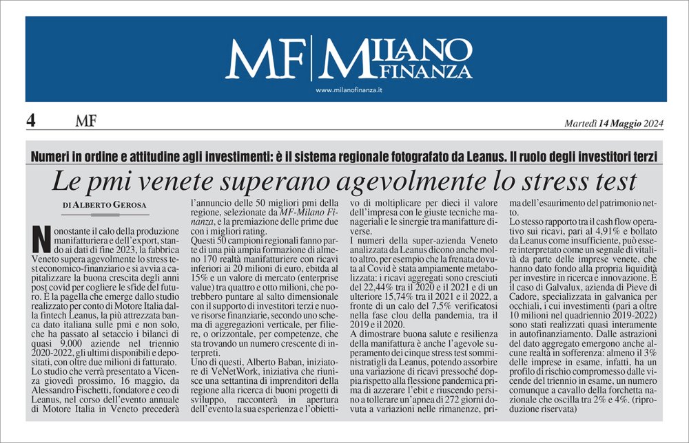 Alessandro Fischetti, Leanus Administrator, he was a guest of Motor Italy Veneto to discuss the regional business system and to present the research and data analysis of the Milano Finanza rankings. From the factual study by Leanus it emerges that, despite the decline in manufacturing production and exports, the Veneto factory easily passed the economic-financial stress test.