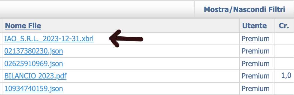 IMPORTANT: if the analysis update creation operation was carried out by taking the balance sheets directly from the Company Register, the file used for the analysis will be the original one in PDF format. XBR extension and can be downloaded with a simple click. In any case, it is possible to recover the files (regardless of the format) used to process the analysis.