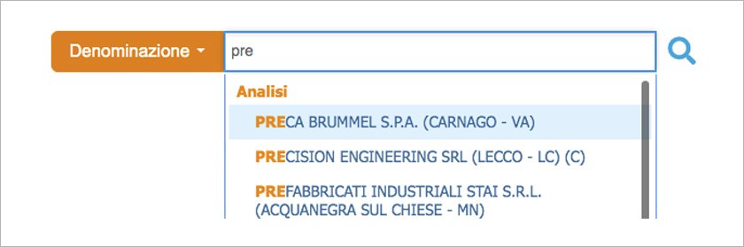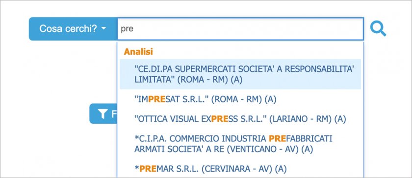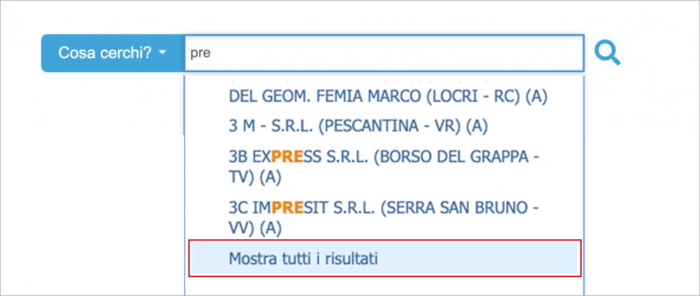 Il caja de búsqeda está presente en página de inicio y todas las demás páginas del software. El cuadro está preestablecido a la opción "Qué estás buscando" que le permite buscar por nombre, código fiscal o cualquier otra clave. Con esta opción los caracteres escritos (ej. "pre") se buscan al principio o dentro del texto y en todos los campos de datos personales. Además de las empresas que cumplen con los criterios de búsqueda, los resultados relacionados con: