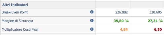 Tanto en datos históricos como en los datos del Benchmark y el Business Plan, el punto de equilibrio es visible en la parte inferior de la tabla; los análisis gráficos están presentes en el Resumen del Menú de Análisis de Balance y en el análisis gráfico de la Cuenta de Pérdidas y Ganancias de Benchmark y Business Plan. El punto de equilibrio y el multiplicador de costos fijos también están presentes en las casillas presentes en el menú de inicio