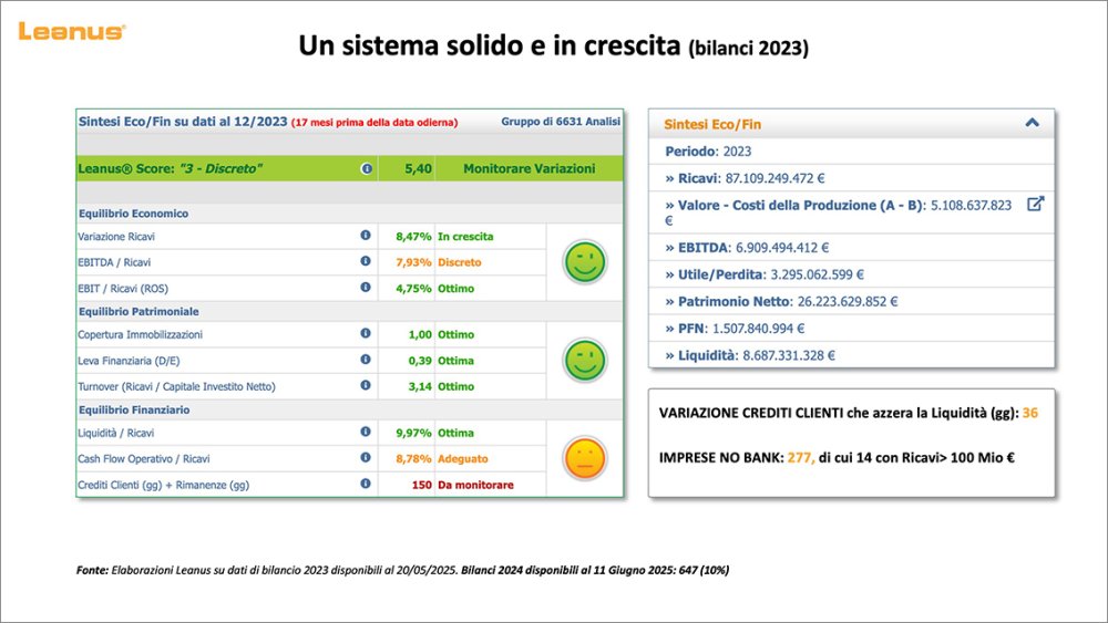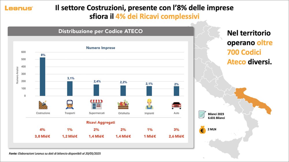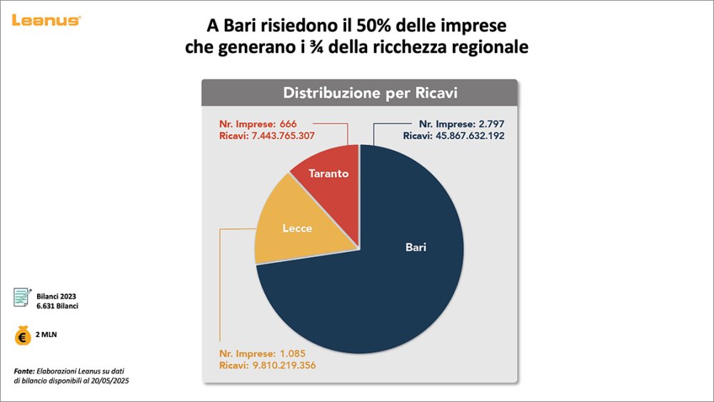 El sistema de Puglia cuenta 25 mil sociedades anónimas, de los cuales 6.631 tener ingresos superiores 2 millones. Los ingresos totales son 90 mil millones. El margen operativo de las empresas del sistema de Puglia es del 8% y un beneficio del 4%. Sobre el 10% de las empresas del sistema de Puglia Ha logrado resultados positivos a lo largo del tiempo sin recurrir al sistema bancario.