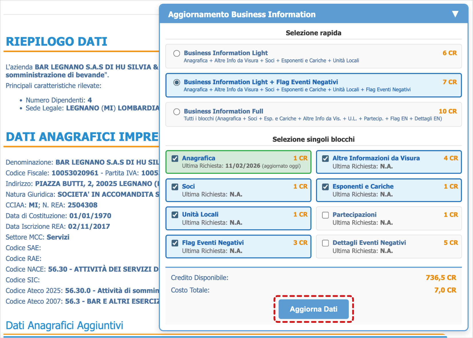 Al hacer clic en Ver informe, aparece el cuadro Actualización de información empresarial Con esta opción, puede configurar el informe seleccionando el contenido de forma masiva o individual. El coste de esta operación se muestra en la esquina inferior derecha.