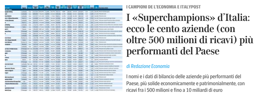 Il Corriere publicó recientemente los Superchampions, el ranking de las mejores empresas con más de 500 millones de euros de facturación.