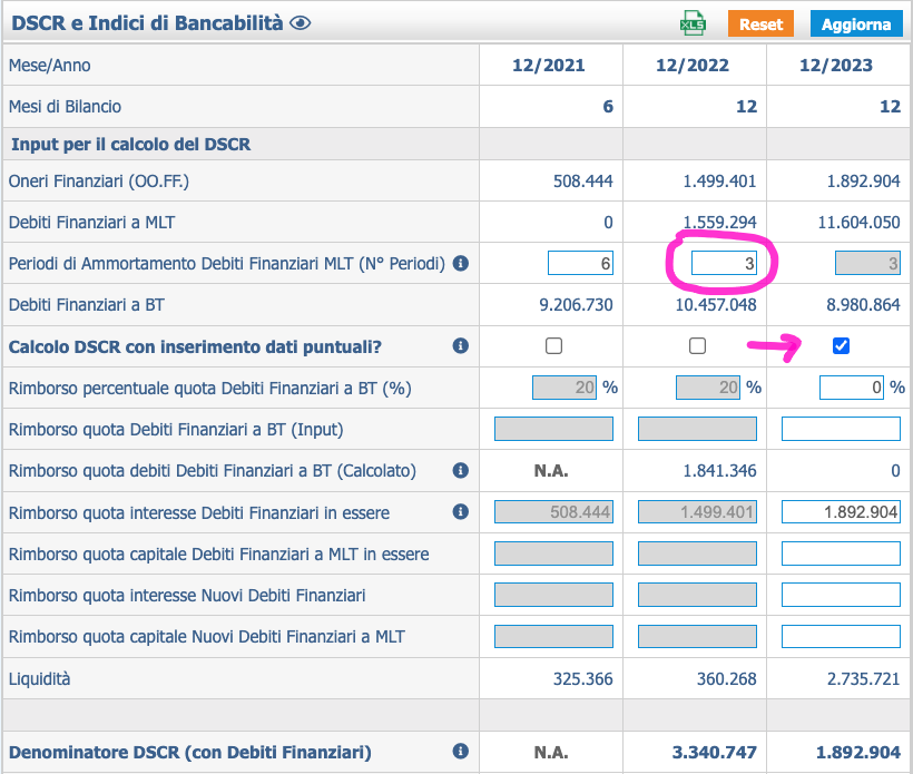 Nell’esempio riportato nell’immagine per l’anno 2022 il checkbox non è flaggato in quanto non si conosco i dettagli. In tal caso il servizio del debito ovvero il denominatore del DSCR sarà calcolato per approssimazione secondo il seguente algoritmo: