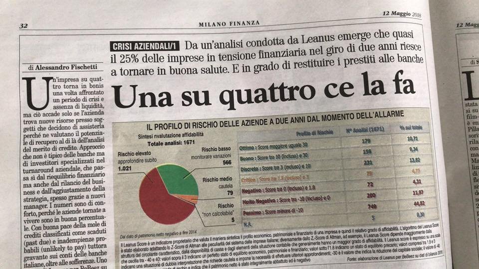 Uno studio condotto da Leanus per BeBeez su campione di 2903 Imprese con ricavi maggiori di un milione di euro che avevano depositato il bilancio 2014 con un patrimonio netto negativo dimostra che il 55% di quelle imprese (cioè 1671 imprese) era ancora attiva dopo due anni, cioè a fine 2016, e di queste imprese attive, il 43% era tornato in bonis, il 12% aveva migliorato la sua situazione seppur mantenendo forti segnali di crisi e il restante 45% era sopravvissuto, ma con un profilo di rischio fortemente compromesso. Dell’altro 45% delle 2903 aziende che a fine 2014 avevano patrimonio netto negativo, 83 risultavano in liquidazione a fine 2016, mentre le altre 1228 a oggi non hanno ancora depositato il bilancio 2016, segnale questo che probabilmente si tratta di aziende che hanno avuto dei problemi e che potrebbero quindi non avercela fatta a due anni dall’evidenza di patrimonio netto negativo. In ogni caso, delle 83 imprese in liquidazione nel 2016, solo tre risultano sono andate in default nei successivi 14 mesi (gennaio 2017-febbraio