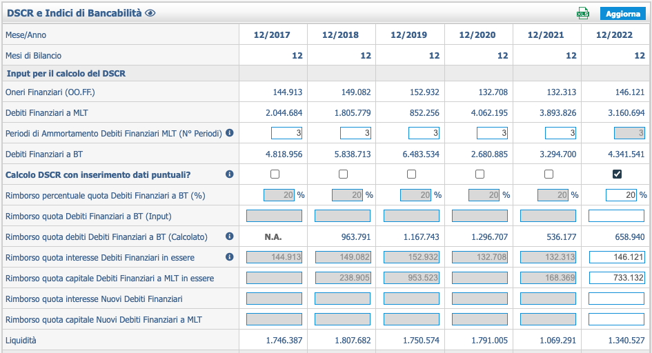 - Debiti Finanziari a MLT / periodi di ammortamento (preimpostato a 3 e modificabile)