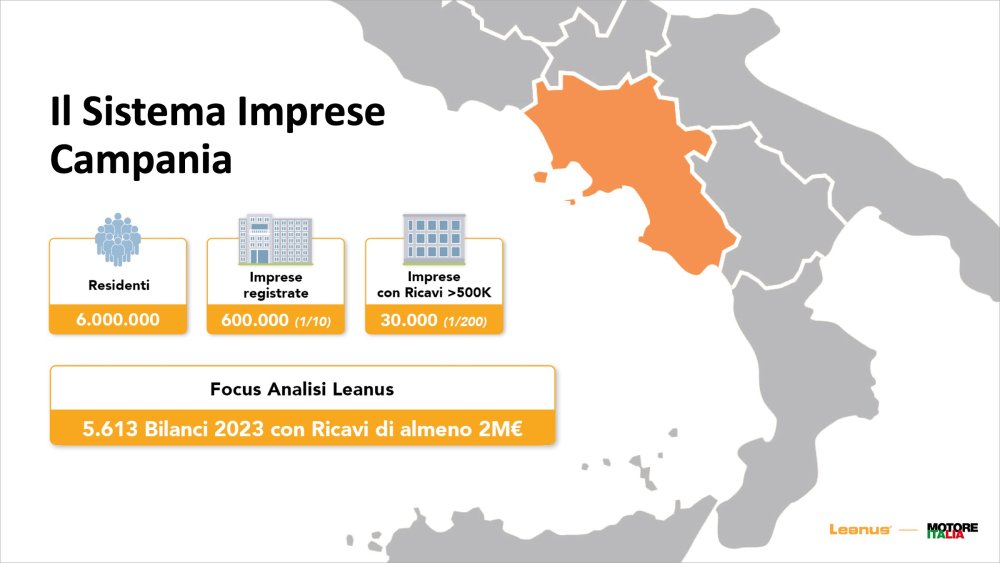 Alessandro Fischetti, Amministratore Leanus, ha presentato a Motore Italia Campania l’analisi delle aziende presenti nella Regione. Partendo dai numeri netti: «In Campania ci sono 6 milioni di residenti, 1 milione più della Sicilia, ma solo 600mila imprese registrate (1 ogni 10 abitanti). Le imprese con almeno 500mila euro di ricavi sono 30mila».