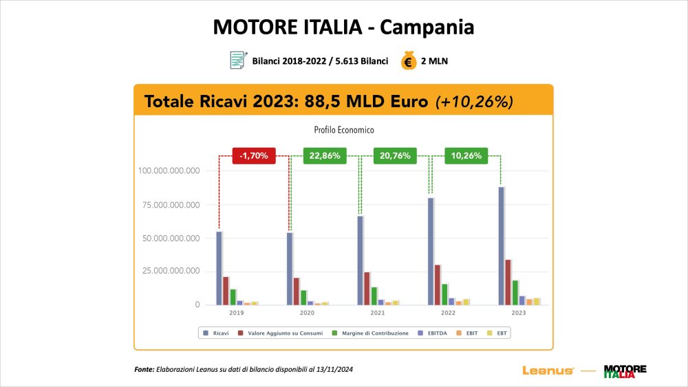 L’analisi evidenzia la grande resistenza delle imprese regionali: «Il sistema Campania ha retto molto bene dopo il Covid: i ricavi hanno fatto segnare il -1,7% nel 2020, +22,8% nel 2021, +20,7% nel 2022 e sopra il +10% nel 2023. La resilienza delle imprese è stata molto alta».