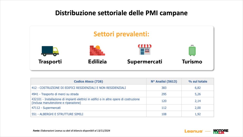 L’analisi ha mostrato inoltre una certa varietà delle aziende campane: «I settori prevalenti, osservando il numero delle imprese presenti, sono i trasporti, l’edilizia, i supermercati e il turismo. Il profilo patrimoniale è assolutamente solido».